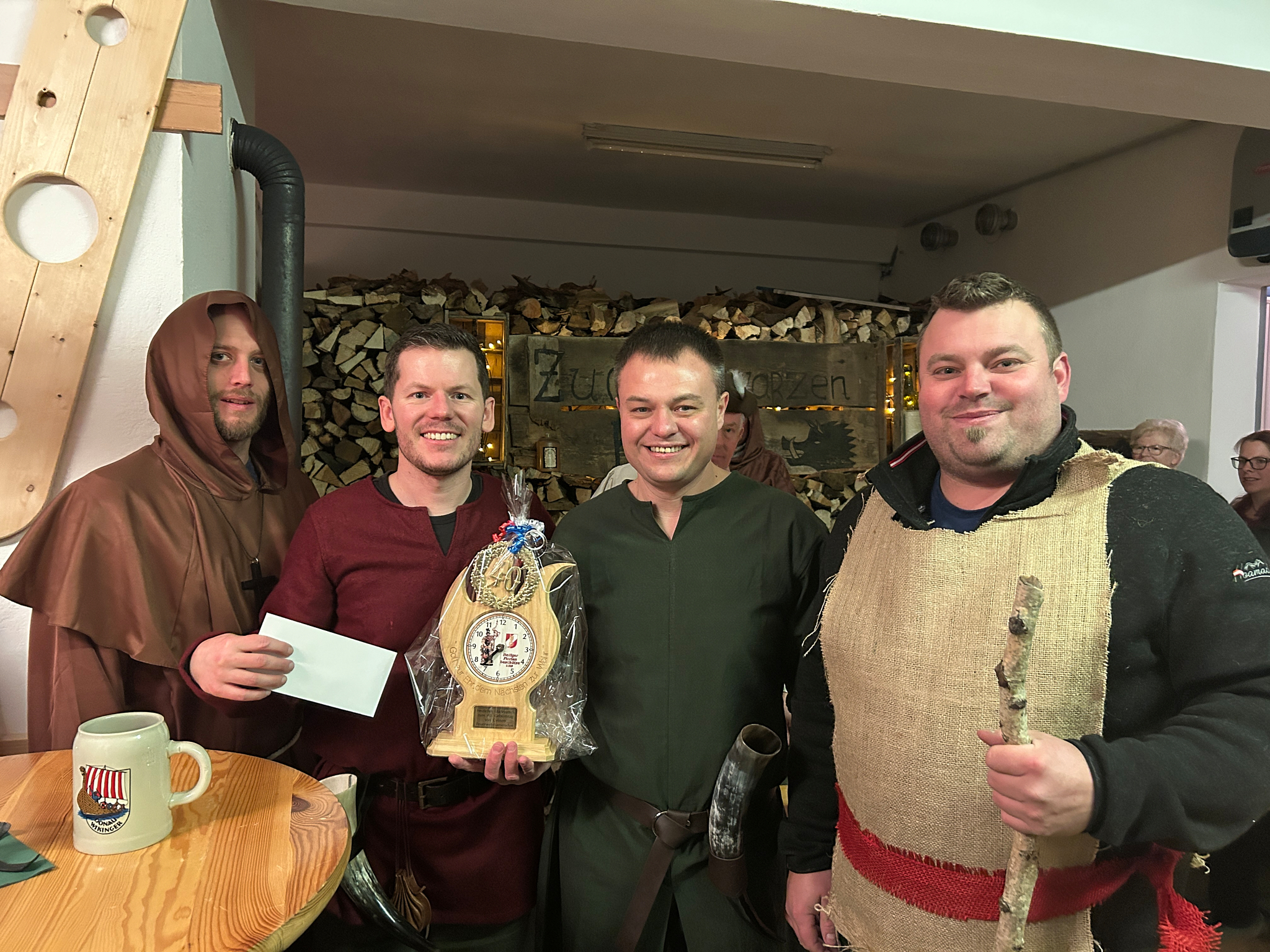 Da Thomas ein großer Mittelalter-Fan ist, stand natürlich auch die Feier im Zeichen des Mittelalters. Viele Gäste kamen gewandet. So auch das Kommando der FF Dorf Rosenau, das dem Jubilar eine Feuerwehr-Standuhr überreichte.