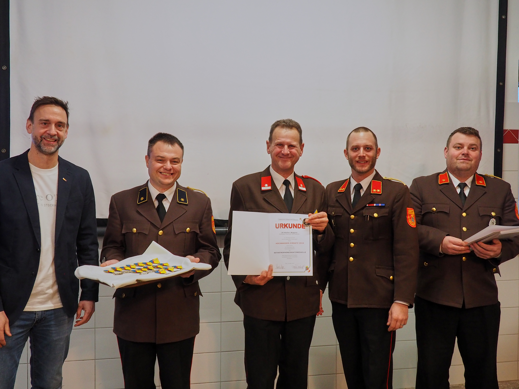 Eine besondere Freude war es sowohl für das Kommando als auch für Stadtrat Weiss den eingesetzten Mitgliedern des „Hochwasser-Einsatzes 2024“ die Katastropheneinsatzmedaille zu verleihen.